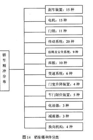精沖工藝技術的發展,使其進入了各個工業領域,得到廣泛的應用。對于要求Zui小尺寸公差、具有Zui小粗糙度的功能零件,可以廣泛使用精沖零件。而對于有視覺要求的、很精細的表面零件,也可使用精沖零件。現今,精沖件的生產品種、尺寸形狀、材料厚度和力學性能都有很大的提高。而且為了適應市場需求,生產的均衡性、質量可靠性和加工經濟性更加突出。汽車工業是精沖技術推廣應用的重中之重,一輛轎車精沖零件擁有量為40~200件,它占轎車沖壓件的60~70%,如下圖所示: